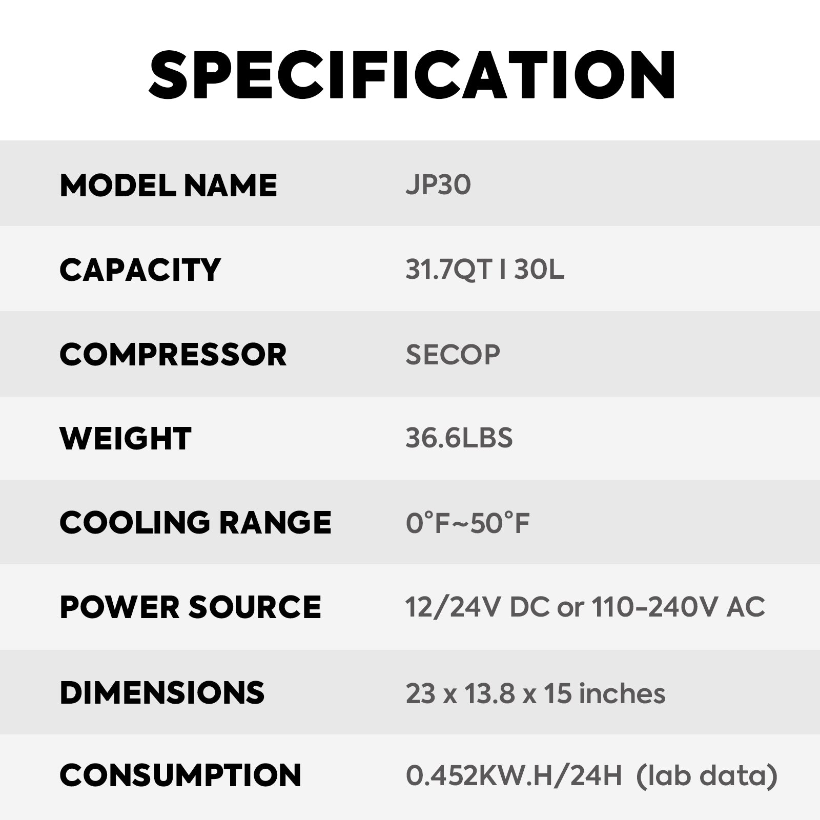 ICECO JP30 is powered by Secop Compressor, a single zone portable refrigerator can be used as a 12v refrigerator or a 12v freezer. Features with 3 stage battery level.
